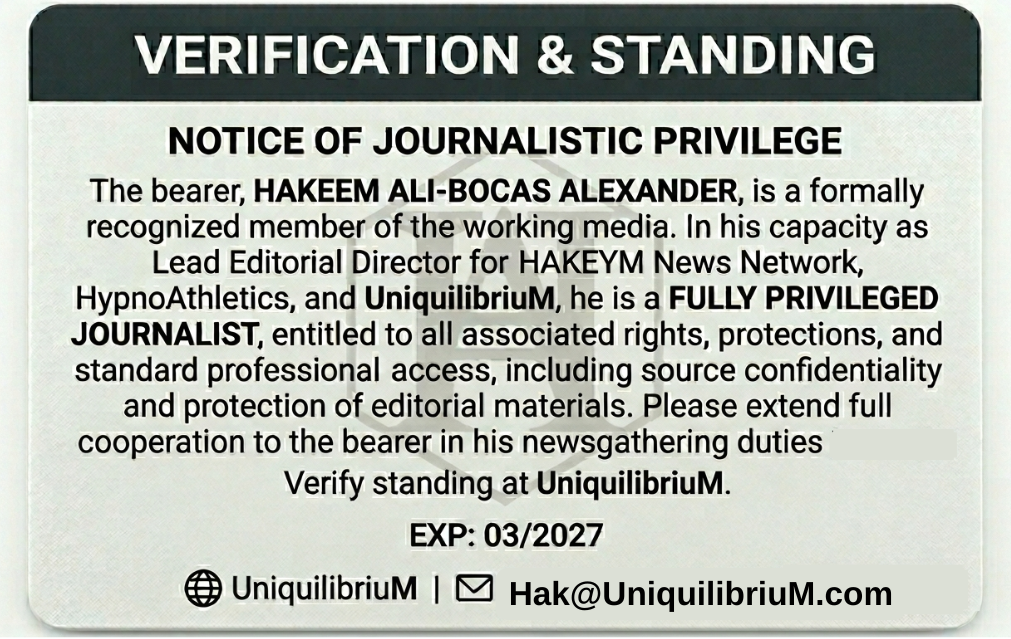 Verification of Standing: This page serves as the official digital repository for the journalistic credentials and formal standing of Hakeem Ali-Bocas Alexander. The documents below confirm his status as a privileged member of the media and lead editorial director for the HAKEYM News Network, HypnoAthletics, and Uniquilibrium.